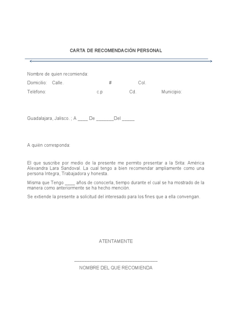 0 ratings0% found this document useful (0 votes). Machote de carta de recomendación para nuevos empleos. Una carta de recomendación laboral es un instrumento por el cual una persona, institución o empresa señala las cualidades o virtudes que ha podido observar y experimentar de un trabajador que en algún momento trabajó con. En comparación con la carta de recomendación laboral, la carta de recomendación personal tiene que ser expedida por una persona que no haya con este formato en pdf, podrás entonces hacer una carta de recomendación con solamente mandar a imprimir dicho documento y llenar sus campos. Carta de recomendación personal laboral » ¿cómo hacer una? Carta de recomendación personal jahzeel.docx via es.scribd.com. So please help us by uploading 1 new document or like us to download En primer lugar, para certificar la veracidad de que la persona ha sido trabajador en dicha empresa, y en segundo lugar, para realizar. Use the download button below or simple online reader. La carta de recomendación personal garantiza nuestra confianza ante otras personas. Carta de recomendación personal ⭐ si estas buscando el modelo o plantilla ideal no dudes en descargarlo en esta web. A diferencia de la carta de recomendación laboral, la carta de recomendación personal debe ser expedida por una persona no afín a un trabajo que se realizó en una empresa. Ejemplos en word y pdf.